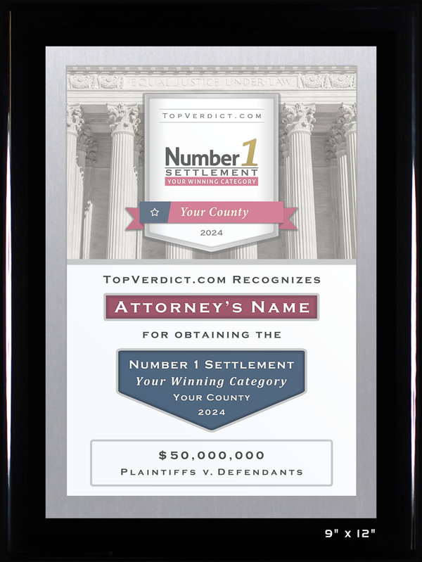 As an attorney who has obtained one of the Number 1 Settlements in Texas Counties in 2024, you have earned the opportunity to display this beautiful plaque in your work or home office. Your potential clients, peers, family, and friends alike will notice and pay the due respect to your new, distinguished status.
