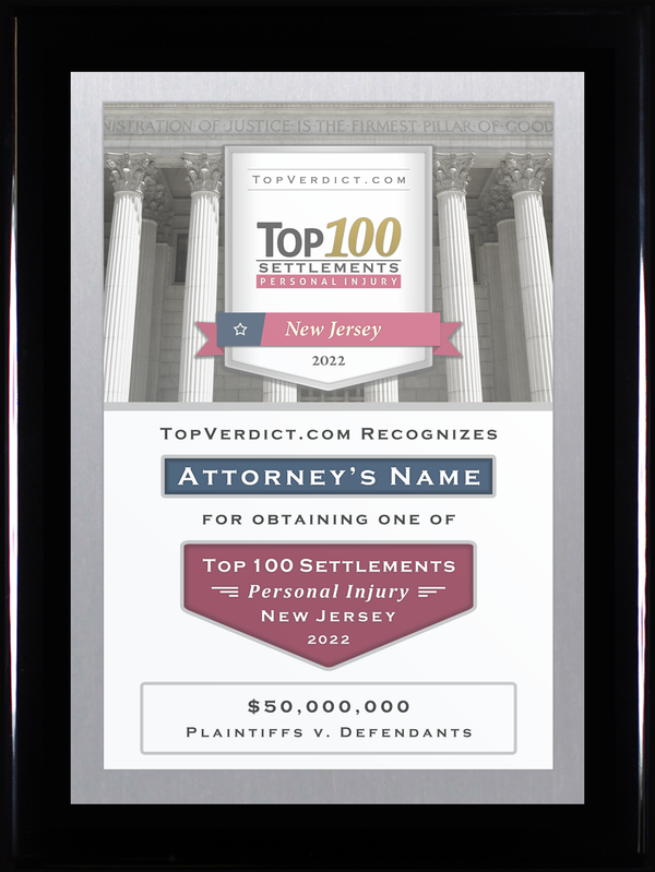 As an attorney who has obtained one of the Top 100 Personal Injury Settlements in New Jersey in 2022, you have earned the opportunity to display this beautiful plaque in your work or home office. Your potential clients, peers, family, and friends alike will notice and pay the due respect to your new, distinguished status.