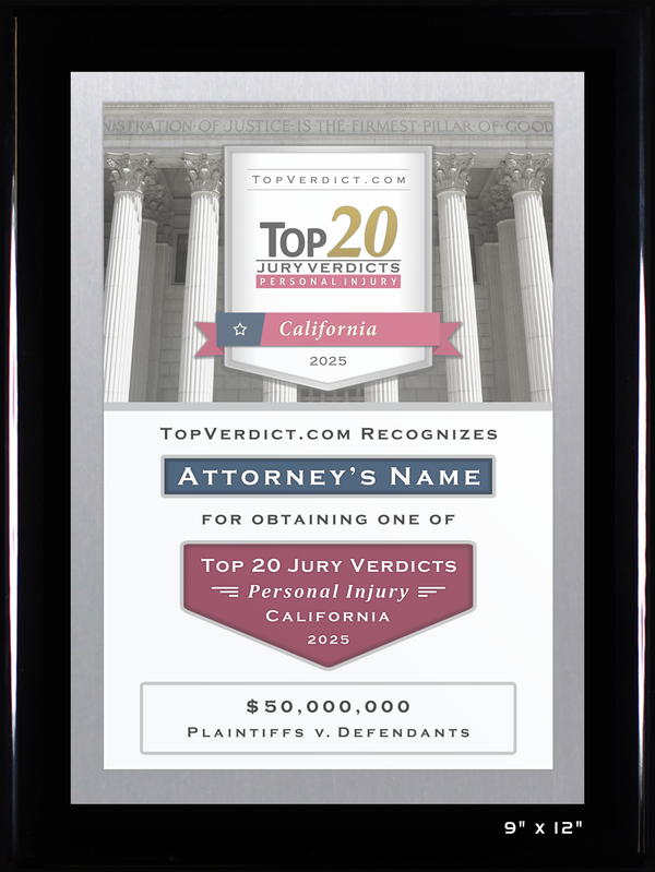 As an attorney who has obtained one of the Top 20 Personal Injury Verdicts in California in 2025, you have earned the opportunity to display this beautiful plaque in your work or home office. Your potential clients, peers, family, and friends alike will notice and pay the due respect to your new, distinguished status.