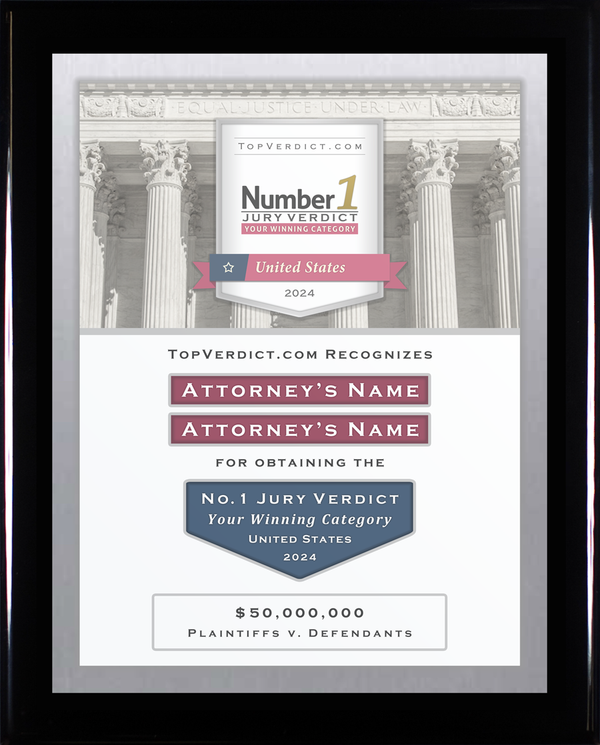 As a legal team that has obtained one of the Number 1 Verdicts in the United States in 2024, you and your co-counsel earned the opportunity to display this beautiful plaque in your work or home office. Your potential clients, peers, family, and friends alike will notice and pay the due respect to your new, distinguished status.