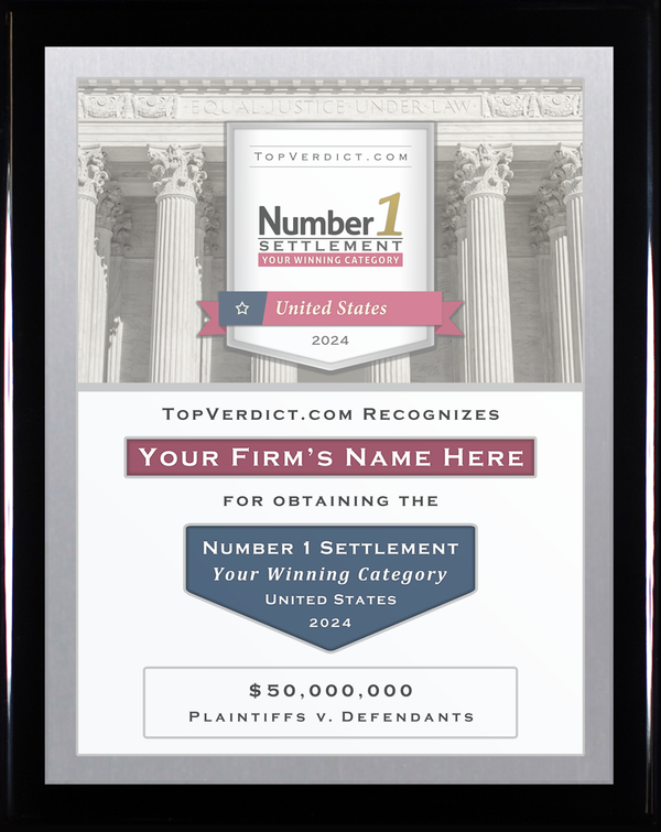 As a legal team that has obtained one of the Number 1 Settlements in the United States in 2024, your firm has earned the opportunity to display this beautiful plaque in its office. Potential clients and peers alike will notice and pay the due respect to the firm's new, distinguished status.