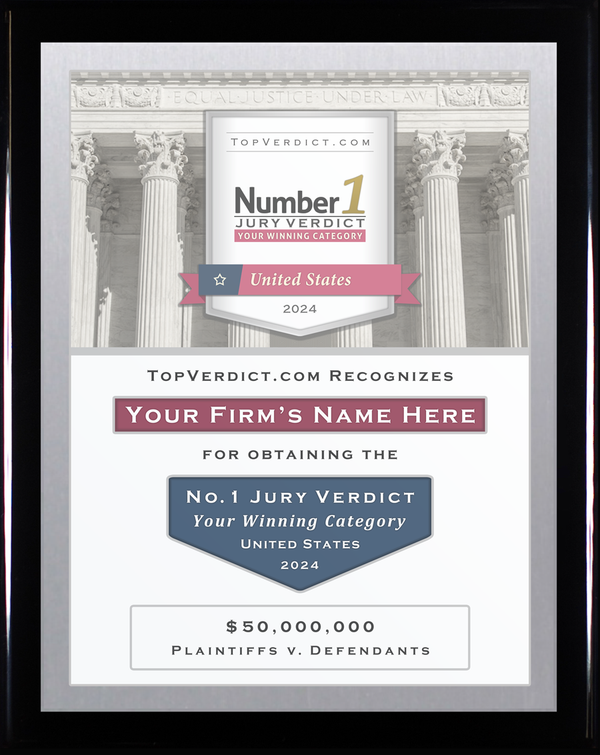 As a legal team that has obtained one of the Number 1 Verdicts in the United States in 2024, your firm has earned the opportunity to display this beautiful plaque in its office. Potential clients and peers alike will notice and pay the due respect to the firm's new, distinguished status.